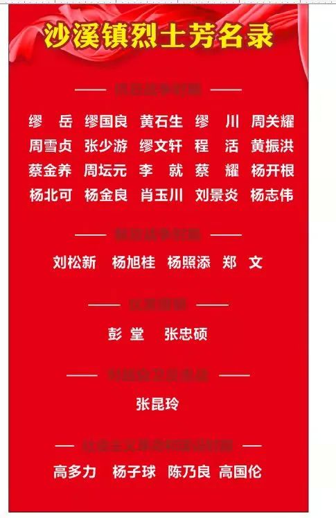 在《中山市民政志》記錄在冊(cè)的沙溪鎮(zhèn)烈士共31名。其中抗日戰(zhàn)爭(zhēng)時(shí)期20名,解放戰(zhàn)爭(zhēng)時(shí)期4名,抗美援朝2名,對(duì)越自衛(wèi)反擊戰(zhàn)1名,社會(huì)主義革命和社會(huì)主義建設(shè)時(shí)期4名。