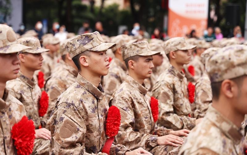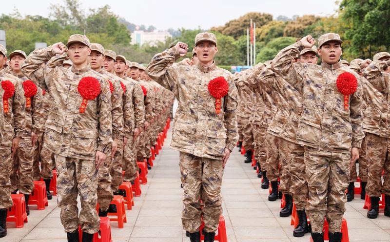3月15日,中山市2023年新兵入伍歡送大會在中山市文化藝術(shù)中心廣場舉行。300多名新兵身穿迷彩服,胸戴大紅花,即將奔赴軍營。中山軍分區(qū)大校司令員、市征兵工作領(lǐng)導(dǎo)小組副組長李云濤,市委常委、中山軍分區(qū)大校政治委員、市征兵工作領(lǐng)導(dǎo)小組副組長劉燦瑩,市征兵工作領(lǐng)導(dǎo)小組副組長、副市長、市公安局局長魯罡,市征兵工作領(lǐng)導(dǎo)小組副組長、市征兵辦主任、軍分區(qū)大校副司令員李健出席送兵儀式。 300多名新兵身穿迷彩服,胸佩大紅花,即將奔赴軍營。記者 文波 攝