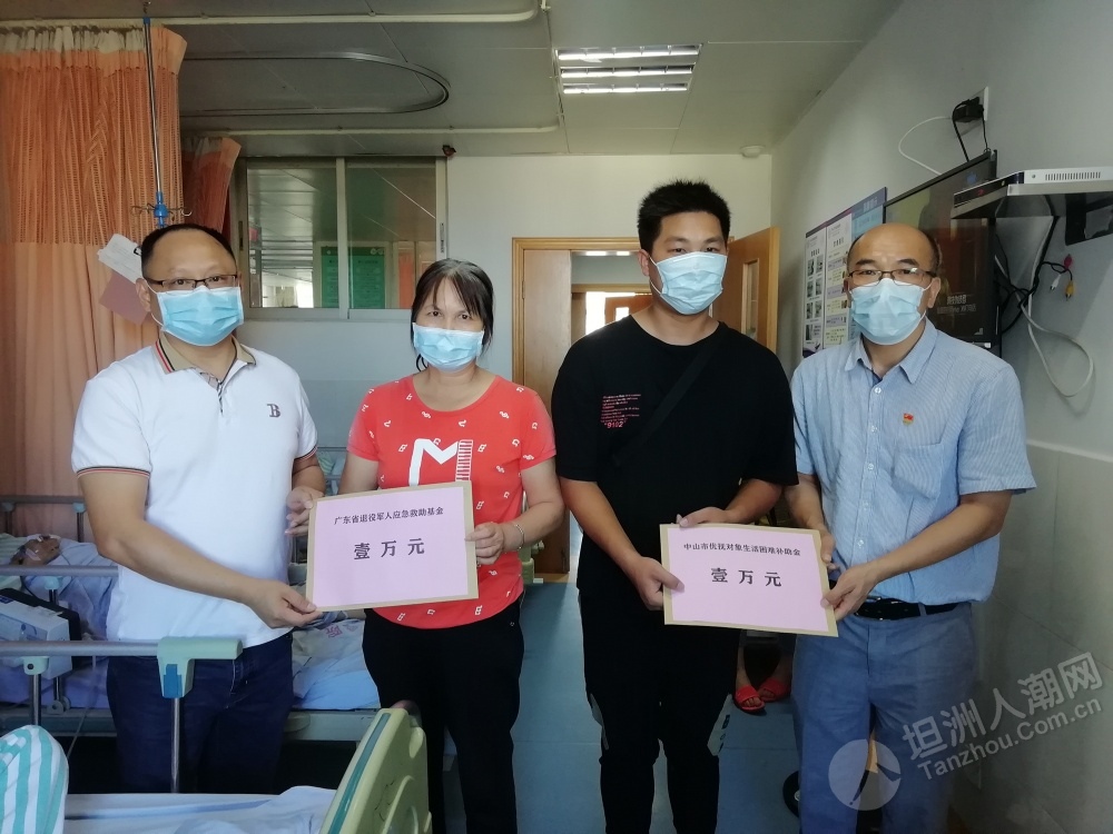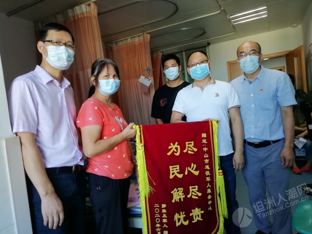 6月18日,中山市、坦洲鎮(zhèn)兩級(jí)退役軍人服務(wù)中心及坦洲社會(huì)事務(wù)局相關(guān)負(fù)責(zé)人一行到坦洲醫(yī)院對(duì)郭叔進(jìn)行慰問,告知他申請(qǐng)的應(yīng)急救助資金已由省退役軍人事務(wù)廳撥付到賬,叮囑他要聽從醫(yī)生的囑咐,積極配合康復(fù)治療,樹立起戰(zhàn)勝疾病的勇氣和信心。郭叔家人特地制作了一面錦旗送到中山市退役軍人服務(wù)中心主任張波手中,由衷表達(dá)了對(duì)市、鎮(zhèn)、村各級(jí)退役軍人服務(wù)中心(站)的感激之情。