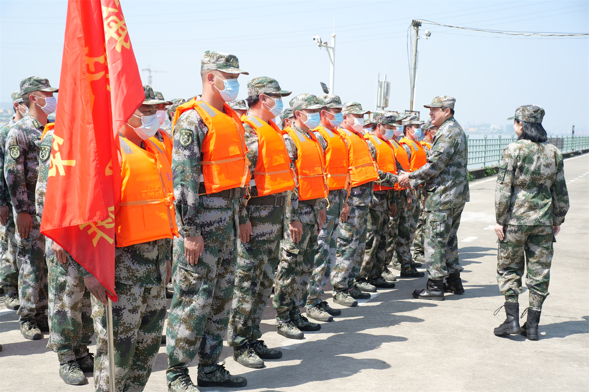 民眾街道河岸線長、水域廣,與港澳水運往來密切,針對當前嚴峻的岸線疫情防控形勢,相關部門以最大的決心、最有力的舉措,筑牢水上防疫安全屏障。劉燦瑩、李健一行趁民眾街道100多名民兵、公安民警交班集結(jié)之際,前往慰問。劉燦瑩要求大家進一步加強岸線巡查,加強“兩反”力度,切實從嚴做好防控工作。