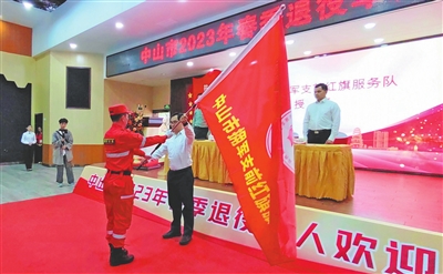 中山市人民政府副市長曾奕給中山市擁軍支前紅旗服務隊授旗。      楊啟寧 攝