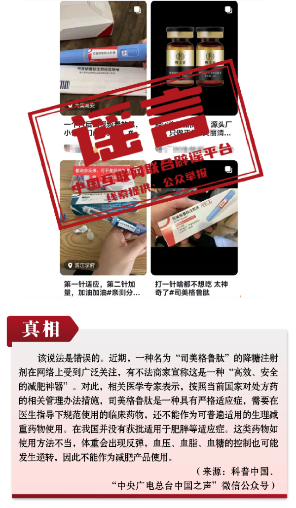 有關(guān)呼吸道疾病防治的謠言和誤區(qū)誤導(dǎo)公眾。隨著各地陸續(xù)入冬,呼吸道疾病進(jìn)入高發(fā)季節(jié),多種呼吸道疾病交織疊加,難免讓人焦慮。恰在此時(shí),網(wǎng)上一些治病養(yǎng)生醫(yī)藥“偏方”頻出,一些自媒體假借專業(yè)人士和醫(yī)生網(wǎng)上“開方”,真假難辨、誤導(dǎo)公眾。如“感染肺炎支原體會得肺炎、會出現(xiàn)‘白肺’”“可自行給孩子服用阿奇霉素等藥物以預(yù)防支原體肺炎”“可網(wǎng)上購買‘醫(yī)院同款’霧化器在家自療”等謠言,抓住人們對疾病的恐懼心理大肆傳播,有的耽誤正常治療,有的則是“假科普、真帶貨”。此外,“使用司美格魯肽能輕松減肥”的謠言,無視權(quán)威部門對處方藥的相關(guān)管理辦法措施,此類藥品若盲目使用或者使用不當(dāng),存在很大健康風(fēng)險(xiǎn)。