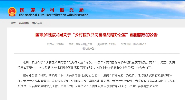記者還了解到,2022年4月份國(guó)家鄉(xiāng)村振興局就在官網(wǎng)上發(fā)布相關(guān)辟謠聲明,并提醒社會(huì)各界群眾應(yīng)提高警惕注意防范,發(fā)現(xiàn)類(lèi)似活動(dòng)及時(shí)向有關(guān)部門(mén)舉報(bào)或報(bào)警處置。