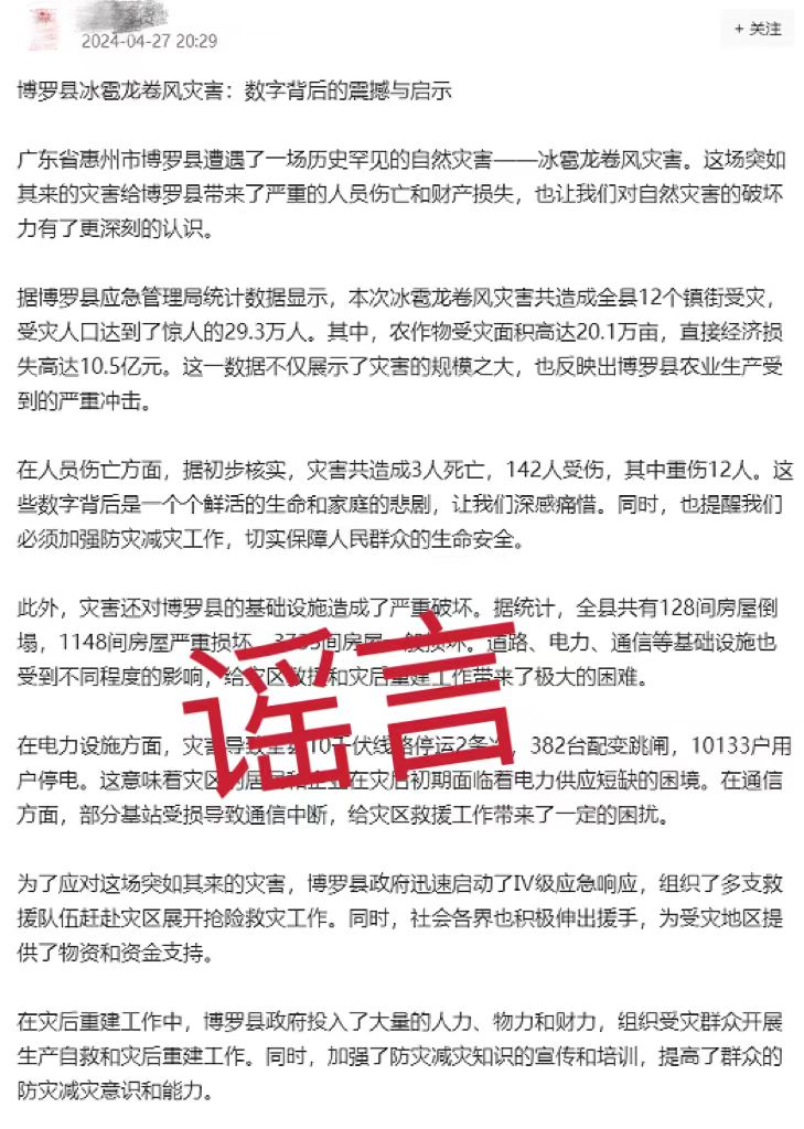 4月27日,博羅公安在工作中發(fā)現(xiàn),有網(wǎng)民在某平臺(tái)發(fā)布帖文,稱“博羅縣遭遇一場歷史罕見的自然災(zāi)害-冰雹龍卷風(fēng)”“災(zāi)害造成3人死亡,142人受傷,其中重傷12人”。