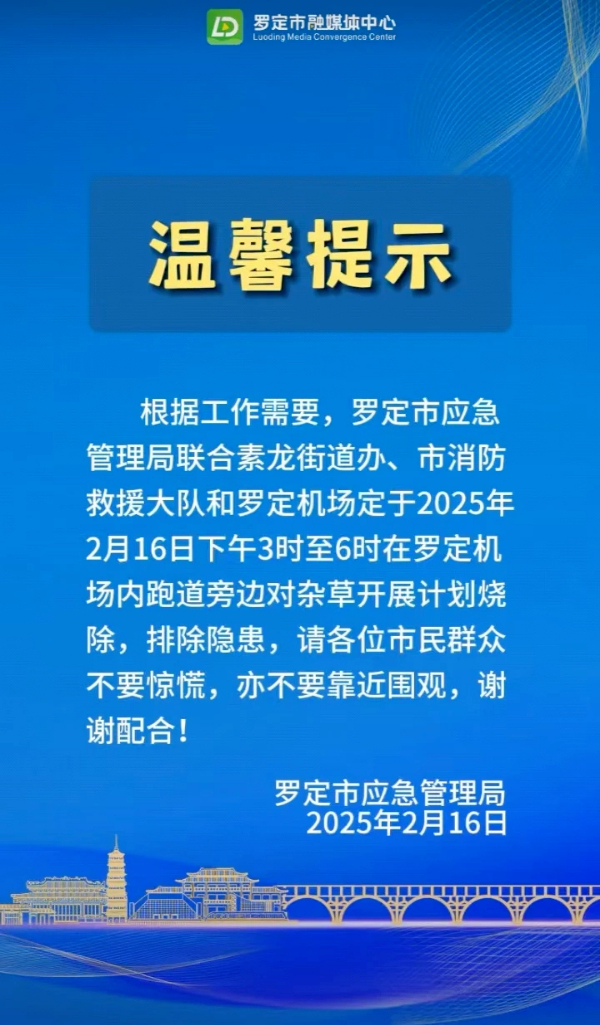 記者查詢發(fā)現(xiàn),羅定市融媒體中心曾于2月16日發(fā)布一則提示,明確表示羅定機場將于2025年2月16日下午3時至6時,在跑道旁開展雜草燒除工作,并提醒市民不必驚慌。