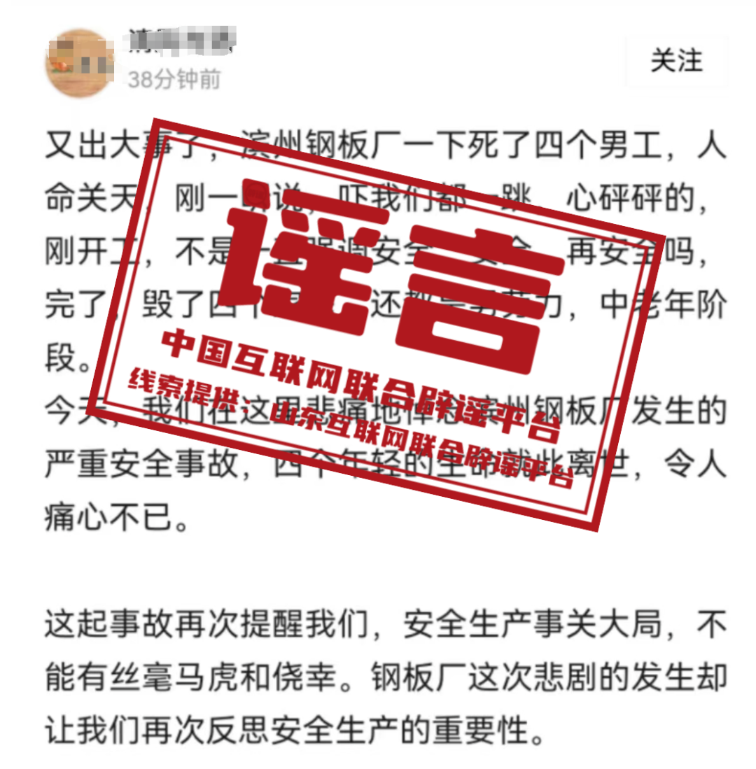 謠 言 山東濱州鋼板廠發(fā)生安全事故死了四個工人?