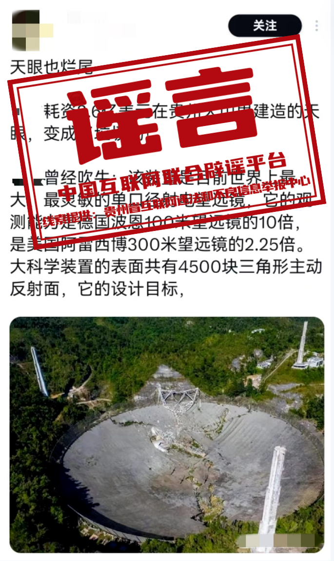真相:近日,海外社交平臺(tái)有網(wǎng)民發(fā)布一張圖片,聲稱“耗資2.6億美元在貴州大山里建造的天眼,變成了垃圾場(chǎng)!”對(duì)此,“貴州辟謠”官方微信公眾號(hào)發(fā)布消息稱,網(wǎng)傳說(shuō)法為謠傳,網(wǎng)傳圖片實(shí)為美國(guó)波多黎各的阿雷西博天文臺(tái)(Arecibo Observatory)于2020年12月發(fā)生徹底坍塌的畫(huà)面,該天文臺(tái)主要的觀測(cè)裝置為阿雷西博射電望遠(yuǎn)鏡。事實(shí)上,這并非“中國(guó)天眼”第一次“被坍塌”,2020年阿雷西博望遠(yuǎn)鏡第一次出現(xiàn)嚴(yán)重?fù)p壞之際,網(wǎng)絡(luò)中就曾出現(xiàn)過(guò)類似謠言。
