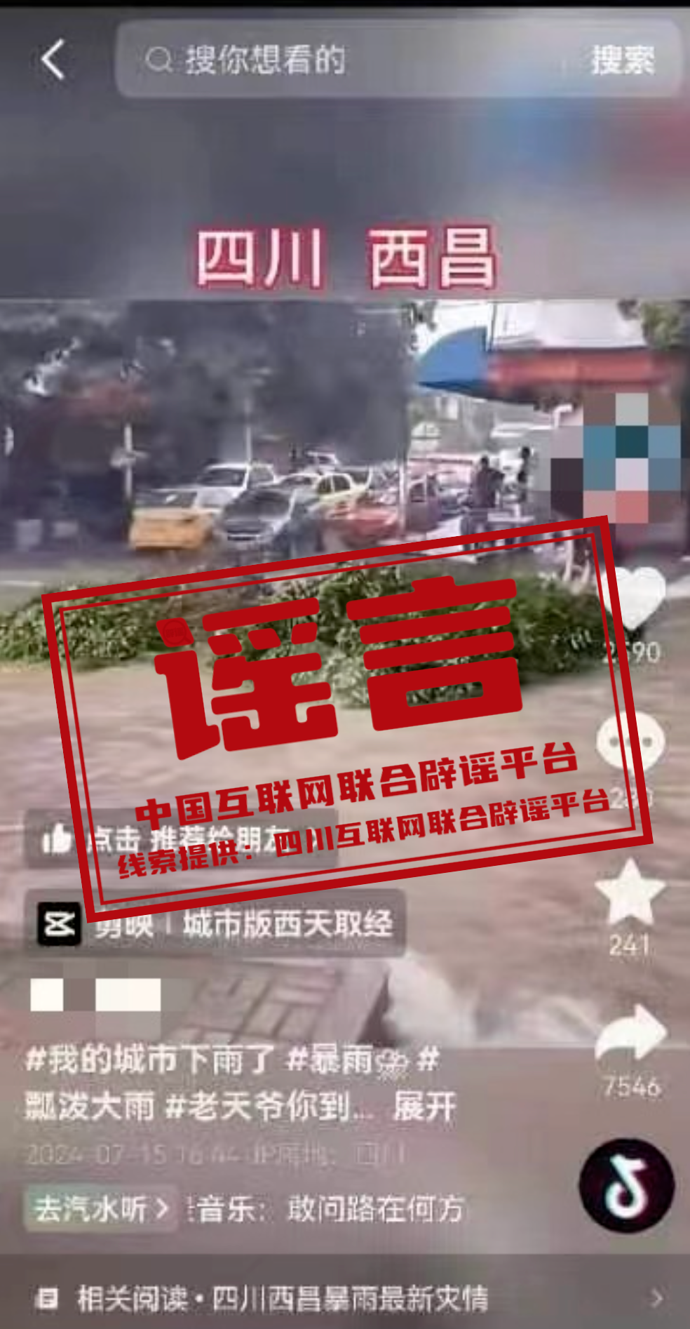 近日,有網(wǎng)民發(fā)布一條視頻,顯示兩人利用被吹斷的大樹枝在街道上乘汛漂流,并在視頻上方標(biāo)注了“四川西昌”的字樣,引發(fā)網(wǎng)民關(guān)注。經(jīng)調(diào)查,該視頻系網(wǎng)民蔡某為博眼球、吸流量,利用短視頻編輯軟件上的模板剪輯而成,并在短視頻平臺進(jìn)行傳播,造成不良社會影響。當(dāng)?shù)毓矙C關(guān)依法對其進(jìn)行處罰,并已責(zé)令其刪除謠言信息。(來源:四川互聯(lián)網(wǎng)舉報辟謠平臺)