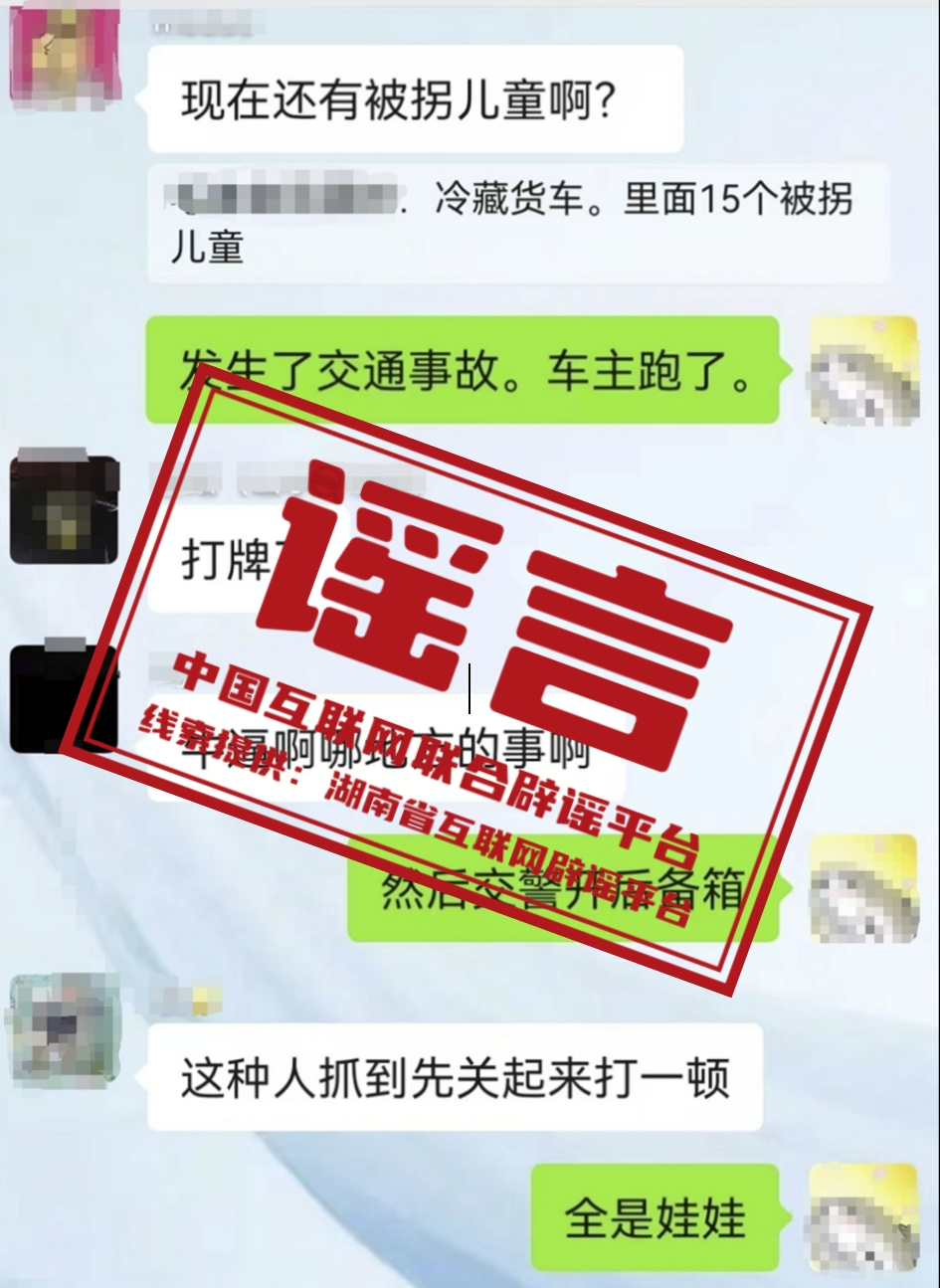 真相:9月4日,一則“湖南一冷藏車發(fā)生交通事故,交警在車上發(fā)現(xiàn)15名被拐兒童”的消息在網(wǎng)絡(luò)社交平臺傳播,引發(fā)網(wǎng)民關(guān)注。5日,湖南省湘潭市公安局雨湖分局發(fā)布警情通報,“經(jīng)公安機關(guān)查證,該信息系謠言”。目前,虛構(gòu)事實擾亂公共秩序的違法行為人朱某已被公安機關(guān)依法行政拘留。(來源:“湖南省互聯(lián)網(wǎng)舉報中心”微信公眾號、“雨湖公安”微信公眾號)