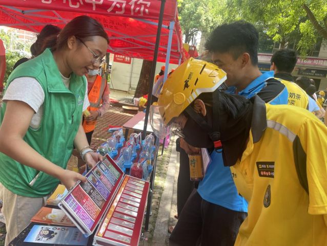 活動伊始,梁主席為活動致辭并給60余名外賣騎手送上夏日清涼飲料及防暑物資,對外賣騎手日常辛苦付出表達(dá)衷心感謝與深情慰問。活動設(shè)置宣傳攤位,外賣騎手與居民群眾駐足攤位前,認(rèn)真聆聽、觀看。禁毒志愿者為大家耐心講解新型毒品的樣式及危害,并結(jié)合騎手配送場景,重點(diǎn)講解“毒駕”危害及可疑包裹識別技巧,強(qiáng)化職業(yè)群體防毒意識,同時警示騎手嚴(yán)守驗(yàn)視制度,若發(fā)現(xiàn)異常訂單,請立即通過“一鍵報(bào)警”功能舉報(bào),防止涉毒食品或物資流入消費(fèi)者手中,共同筑牢外賣配送禁毒防線。