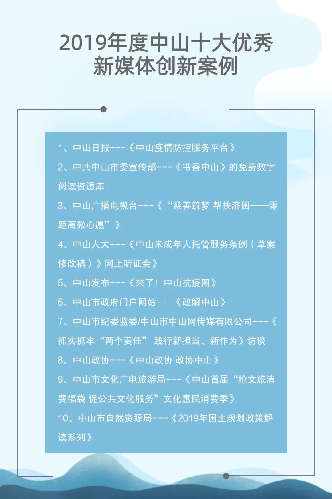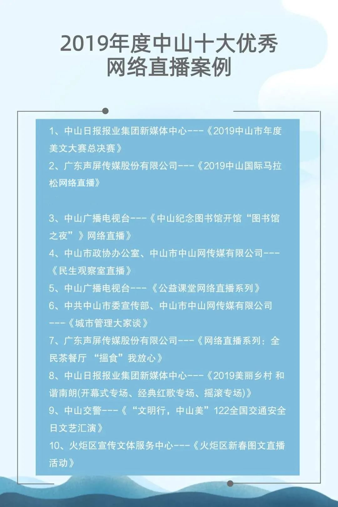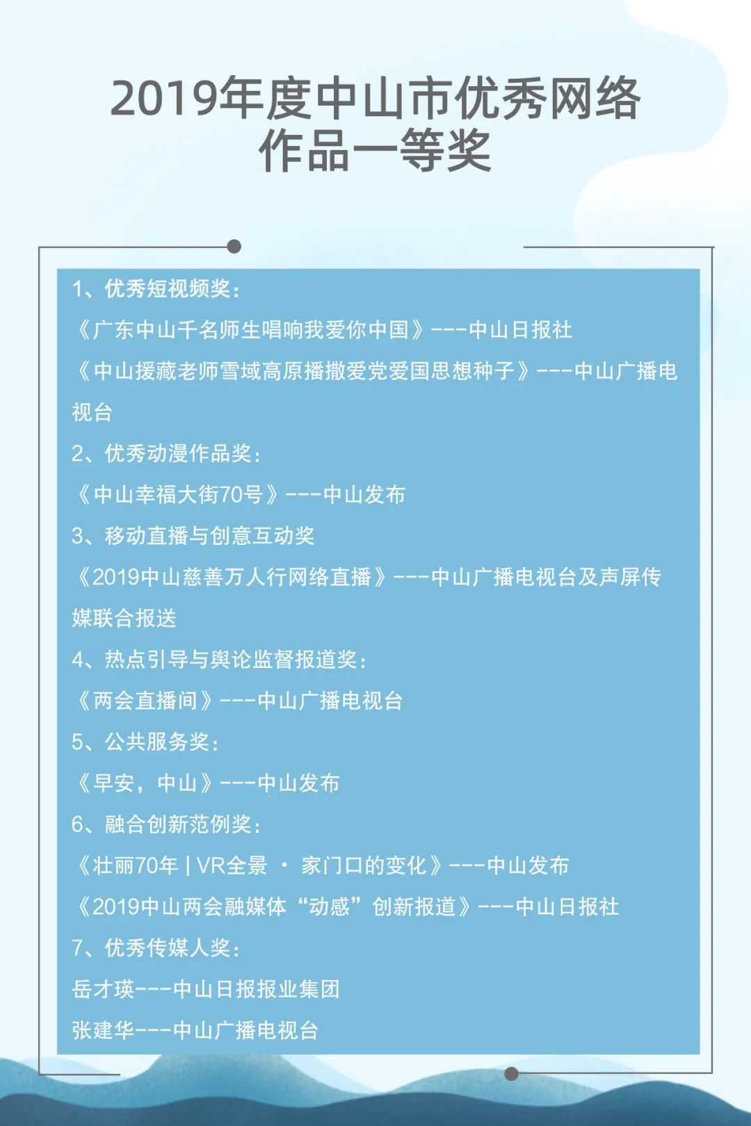 自2015年起,中山市網(wǎng)絡(luò)文化協(xié)會聯(lián)合中山日報(bào)報(bào)業(yè)集團(tuán)、人民網(wǎng)輿情數(shù)據(jù)中心已連續(xù)成功舉辦了四屆中山新媒體影響力年度排行榜發(fā)布會。與此同時,自2017年起,中山廣播電視臺聯(lián)合新榜(上海看榜信息科技有限公司)也已經(jīng)連續(xù)成功舉辦了三屆中山市新媒體頒獎盛典。兩個評選活動通過立標(biāo)桿、樹典型,有效促進(jìn)了中山新媒體的建設(shè)運(yùn)營水平,推動了中山新媒體的健康向上發(fā)展。