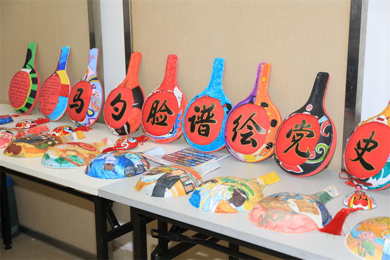 中國共產(chǎn)黨成立100周年標(biāo)識、井岡山勝利會師、南昌起義、嘉興游船上舉行的中共一大、萬里長征路……分享會現(xiàn)場,刻畫了一個個黨史故事的木瓢排列成行,十分引人注目?!斑@是國家級非物質(zhì)文化遺產(chǎn)——馬勺臉譜。它是陜西的傳統(tǒng)民間藝術(shù),以馬勺作‘紙’,將社火臉譜以彩繪的形式繪制在上面?!瘪R勺臉譜傳承者、沙溪中學(xué)老師馬世杰介紹。作為一名美術(shù)老師,馬世杰通過民間藝術(shù)的再創(chuàng)新來引導(dǎo)學(xué)生學(xué)習(xí)黨史,在他的帶領(lǐng)下,沙溪中學(xué)的學(xué)生將南粵特色、中山元素、國風(fēng)動漫等融入馬勺臉譜的創(chuàng)作中?!袄L制黨史故事前,我們查閱了大量資料,并向?qū)<覍W(xué)者請教,在創(chuàng)作中引導(dǎo)學(xué)生們了解、學(xué)習(xí)黨史?!?/p>
